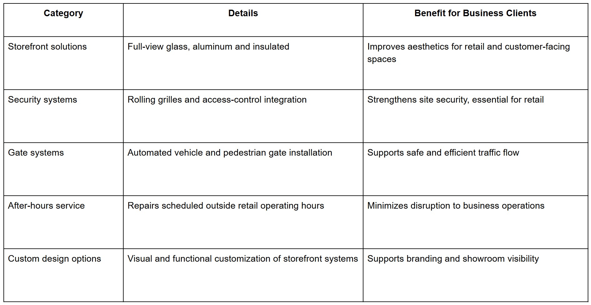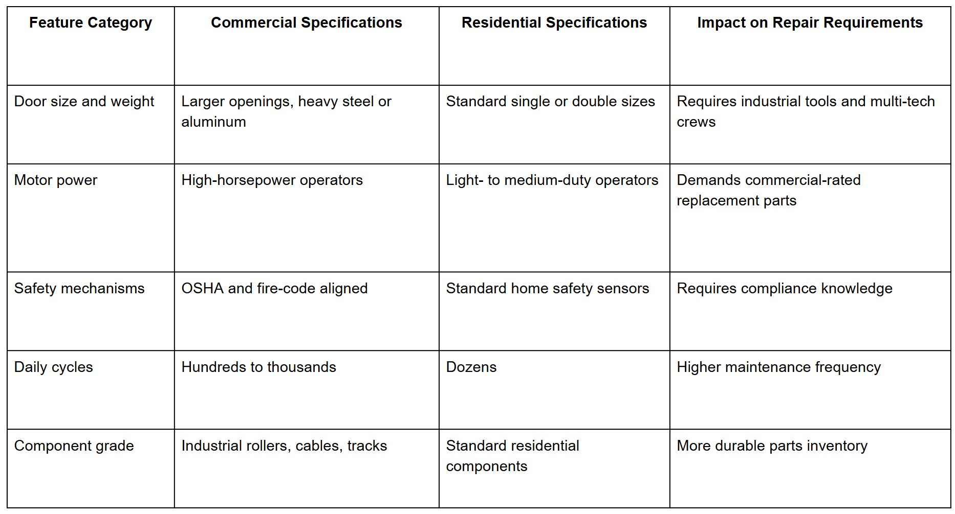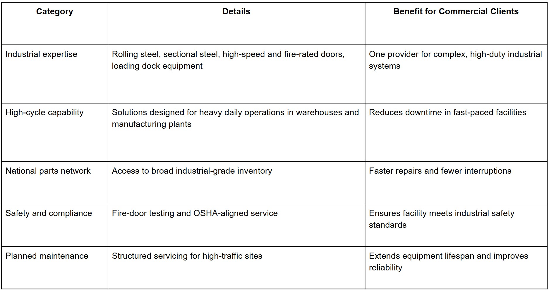 - Commercial-specific expertise: Technicians must be trained for roll-up, sectional, coiling, fire-rated and high-speed systems.
