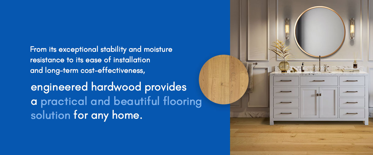Engineered hardwood features a plywood or high-density fiberboard core and a genuine wood veneer. Its multilayer design allows it to resist moisture better than solid wood flooring.
