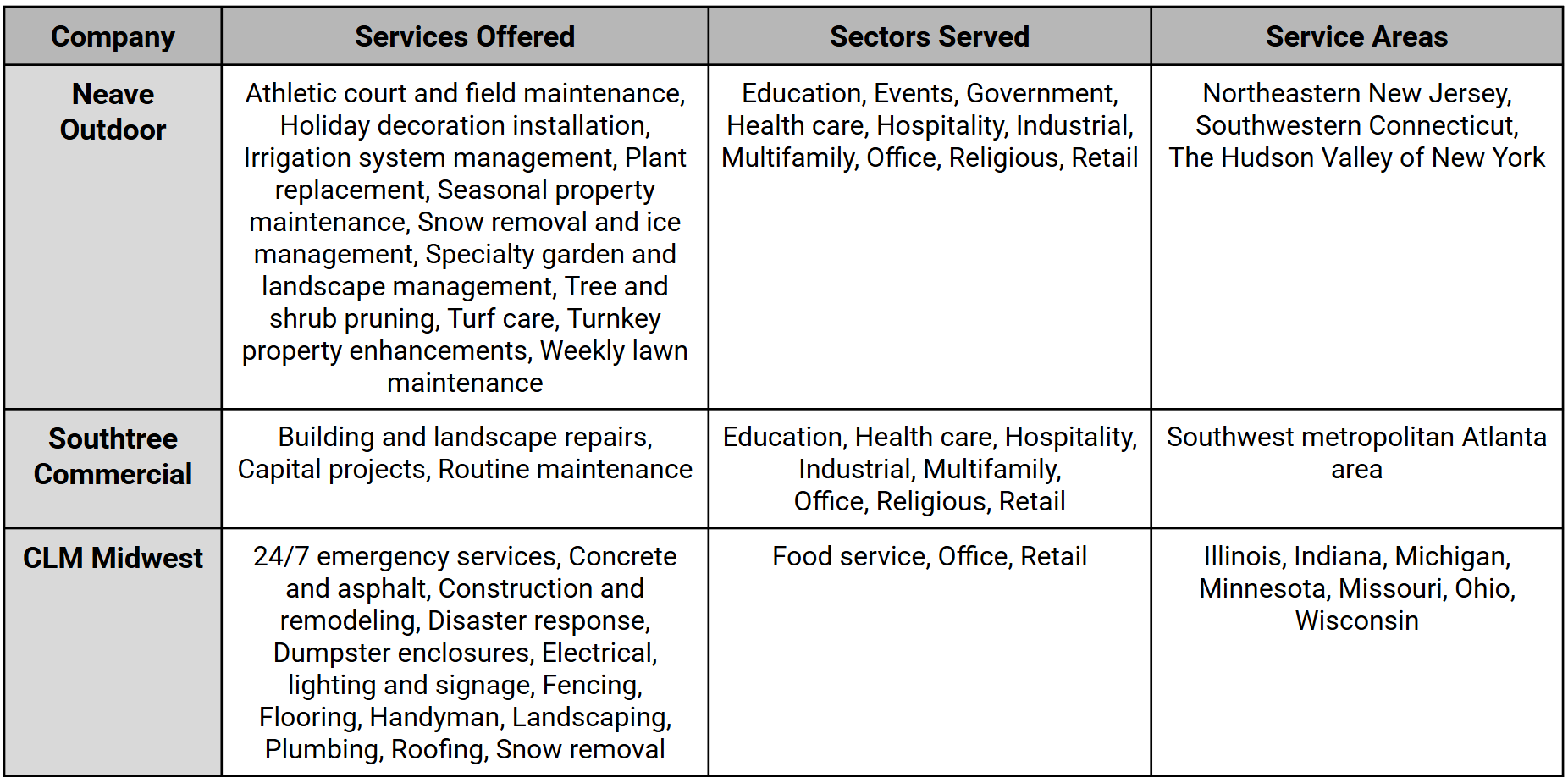 Here’s what Neave Outdoor, Southtree Commercial and CLM Midwest do, what commercial properties they service, and where they operate.