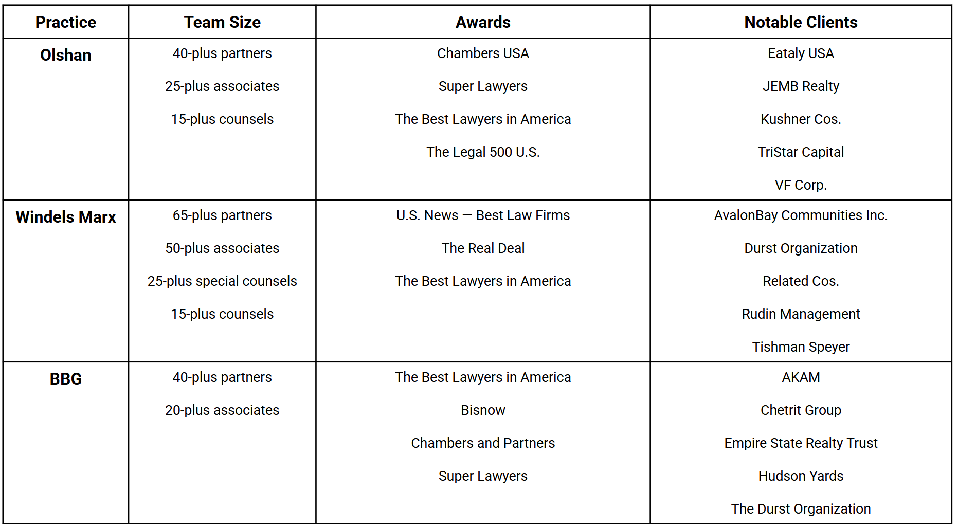 Learn about the number of legal experts at Olshan, Windels Marx and BBG, the most recent accolades they have received and the high-profile clients that trust them.